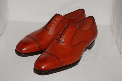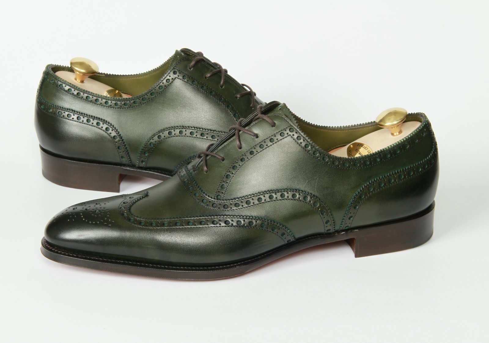 Full brogues, as shown above and directly below, are categorized by several things. First and foremost, they must have a wing-cap toe. Without this, it is not a full brogue, it will be called something else, of which I will get to below. The second thing is that you will find that full brogues will have each of the 5 pieces to the upper: cap, vamp, facing, quarter and counter (in case this is your first time reading, I described all of these here). It will always be the shoe with the most amount of perforations. Now, there are several shoes that may look like a full-brogue but will not be, because they won't have these 5 pieces, such as the Brummell shoe by Edward Green. While I find this shoe much more appealing than a full-brogue, it sadly is not considered one, as it does not consist of all of the necessary components to make it so. Full brogues, however, are in my opinion the most well rounded shoes in dress shoe history, as they can look good with everything, from suits to jeans. This is obviously subjective, but can easily be proven by putting together the proper outfits. Now this can be up for debate, but I was always under the impression that a full brogue needed to be an oxford and not a derby, which would therefore categorize the picture below the 2 directly under this writing to be a semi brogue. However, this I am not 100% sure about.